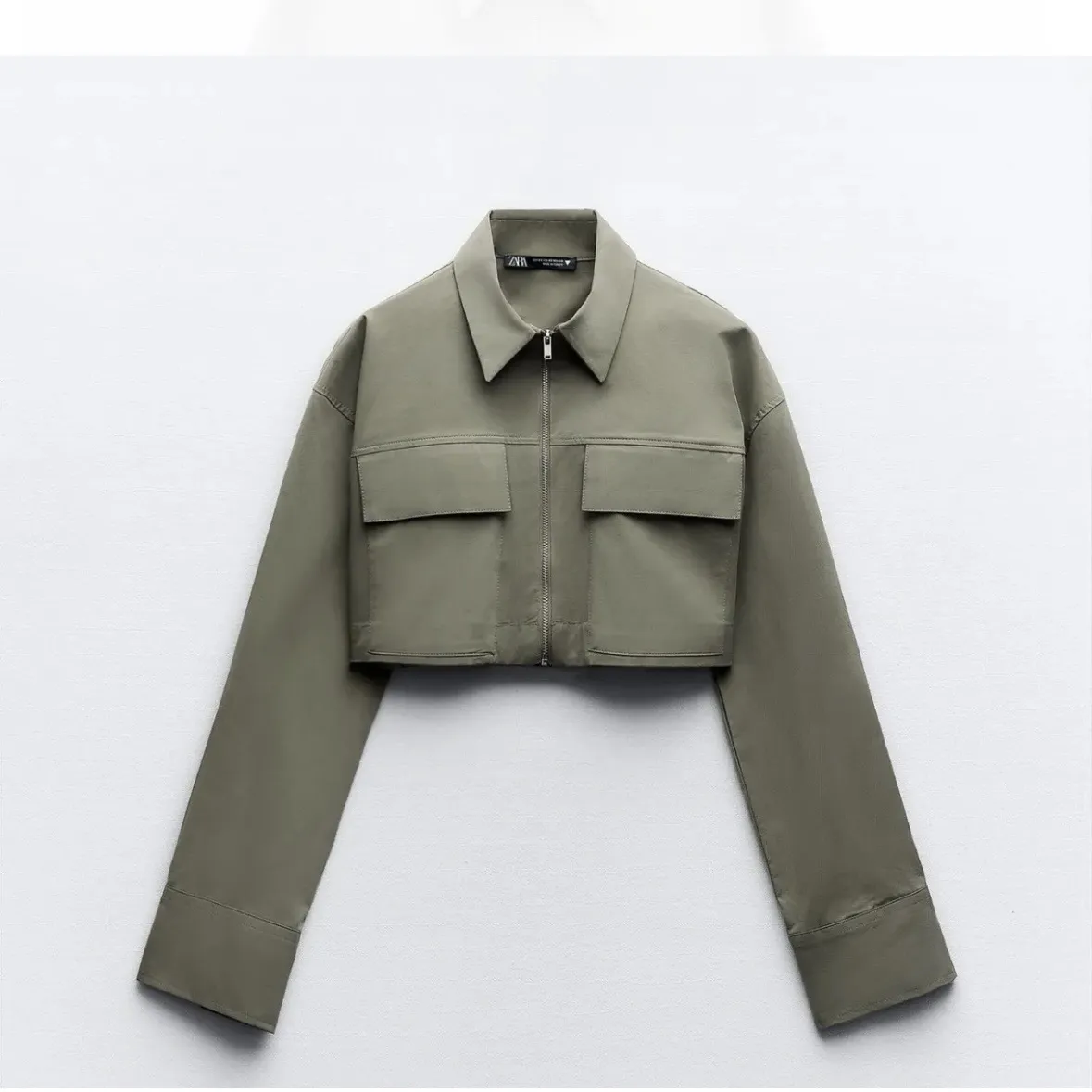Camisa/campera corta de color verde militar con cuello y cierre metálico al frente. Posee dos bolsillos con solapa en la parte superior delantera y puños con botones. nuevo sin uso!