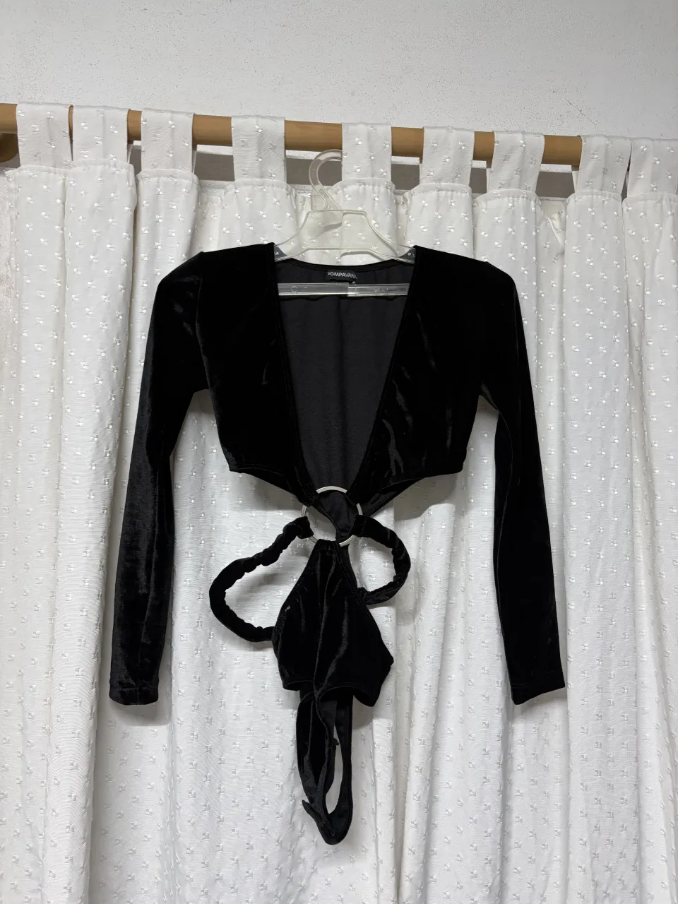 Top negro de terciopelo con escote pronunciado y mangas largas. Posee un detalle de argolla metálica en el frente y tiras para atar en la espalda.