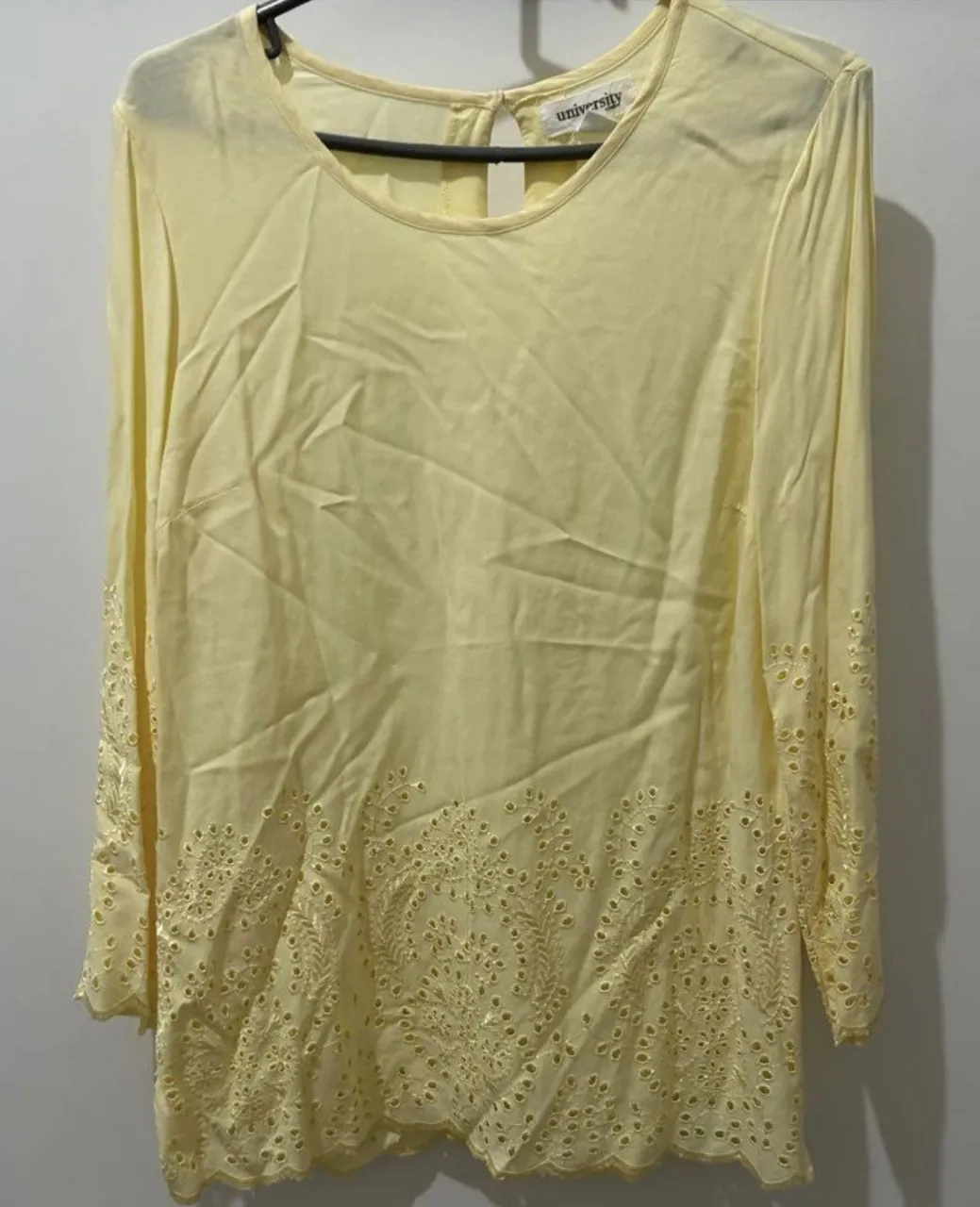blusa university club amarillo claro. perfecto estado, un uso. marcada como talle s pero es chica y no cede, va más para xs hombro a hombro 38cm, axila a axila 41cm, largo 65cm, largo mangas 51cm