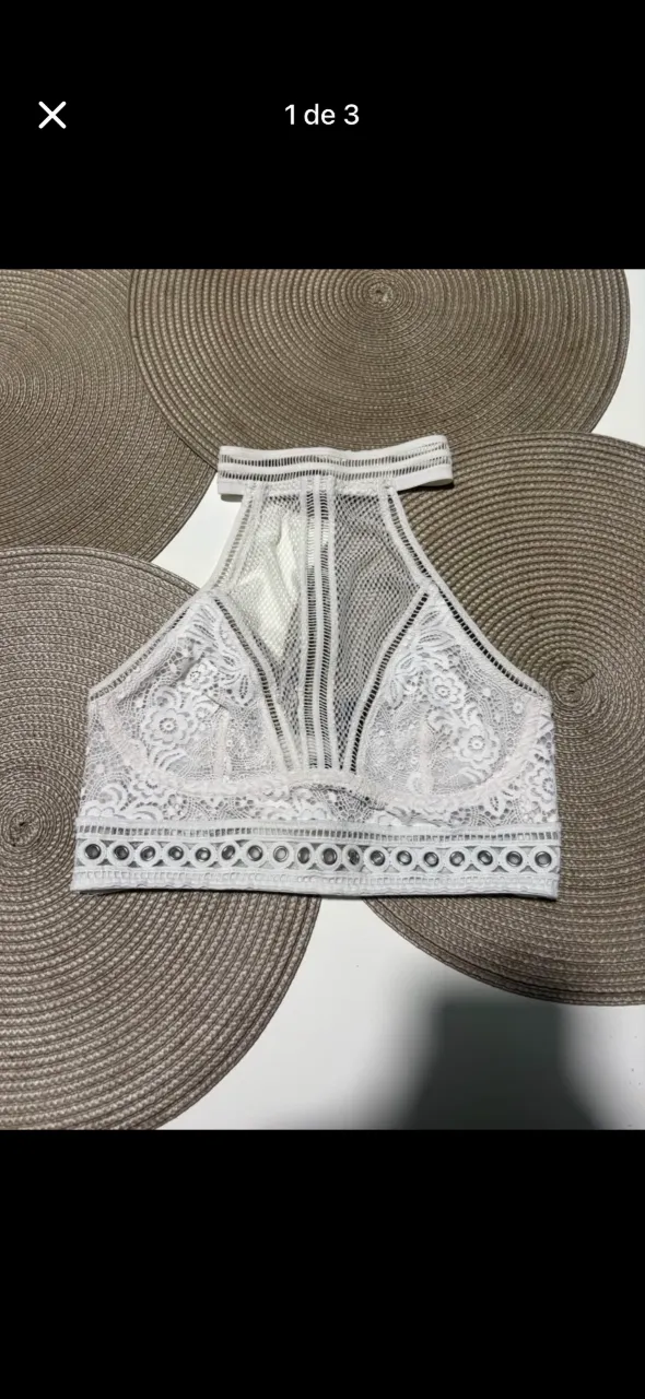 Corpiño de encaje blanco con cuello halter y detalles de tiras finas. Posee un borde inferior con ojales y detalles de puntilla.