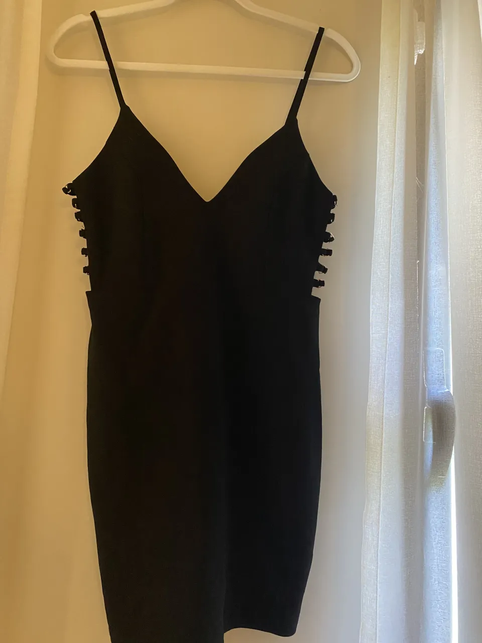 Vestido negro corto con tiras y detalles metálicos en los laterales. Escote en V pronunciado y cierre delantero. Ideal para una salida nocturna o fiesta.