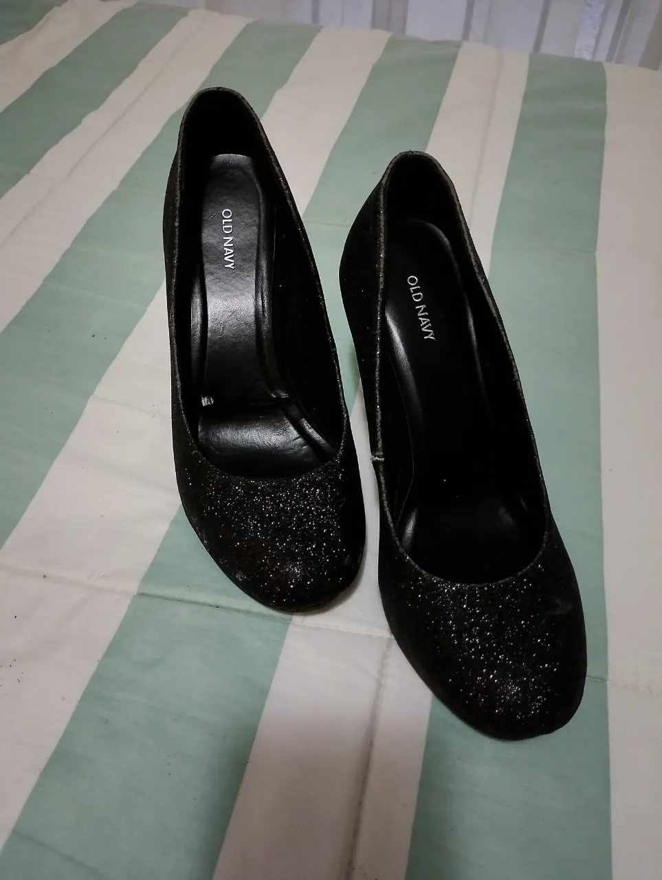 Zapatos de taco alto negros con brillos, ideales para fiestas o eventos. Marca Old Navy.