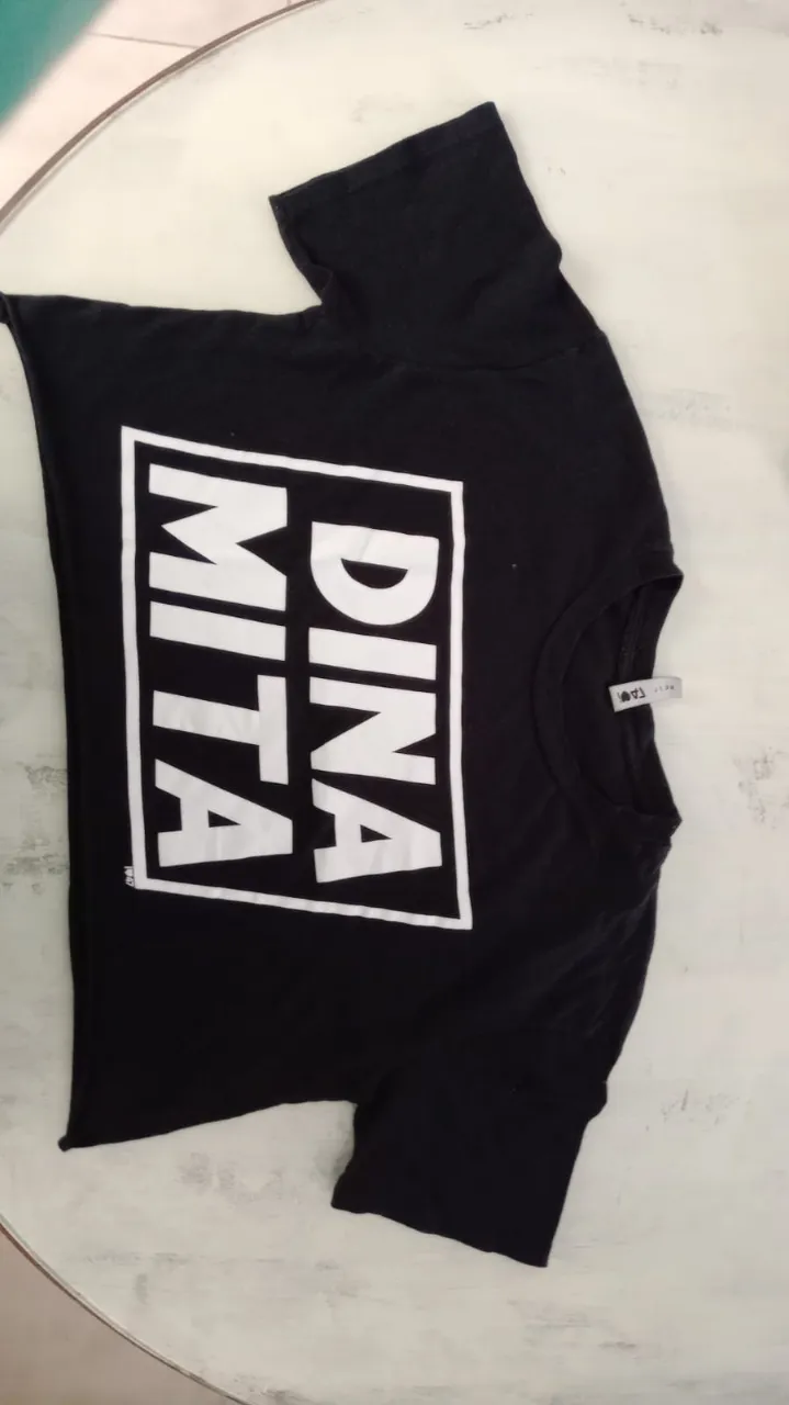 Remera negra corta con estampa "DINA MITA" en blanco. Ideal para un look casual y moderno.