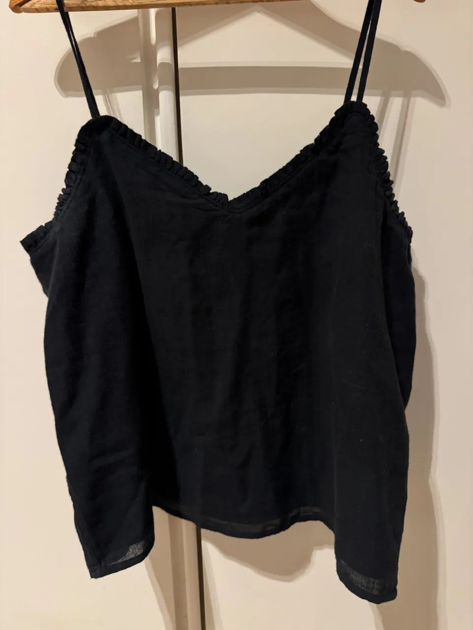 Top negro con tiras finas regulables y detalle de volados en el escote