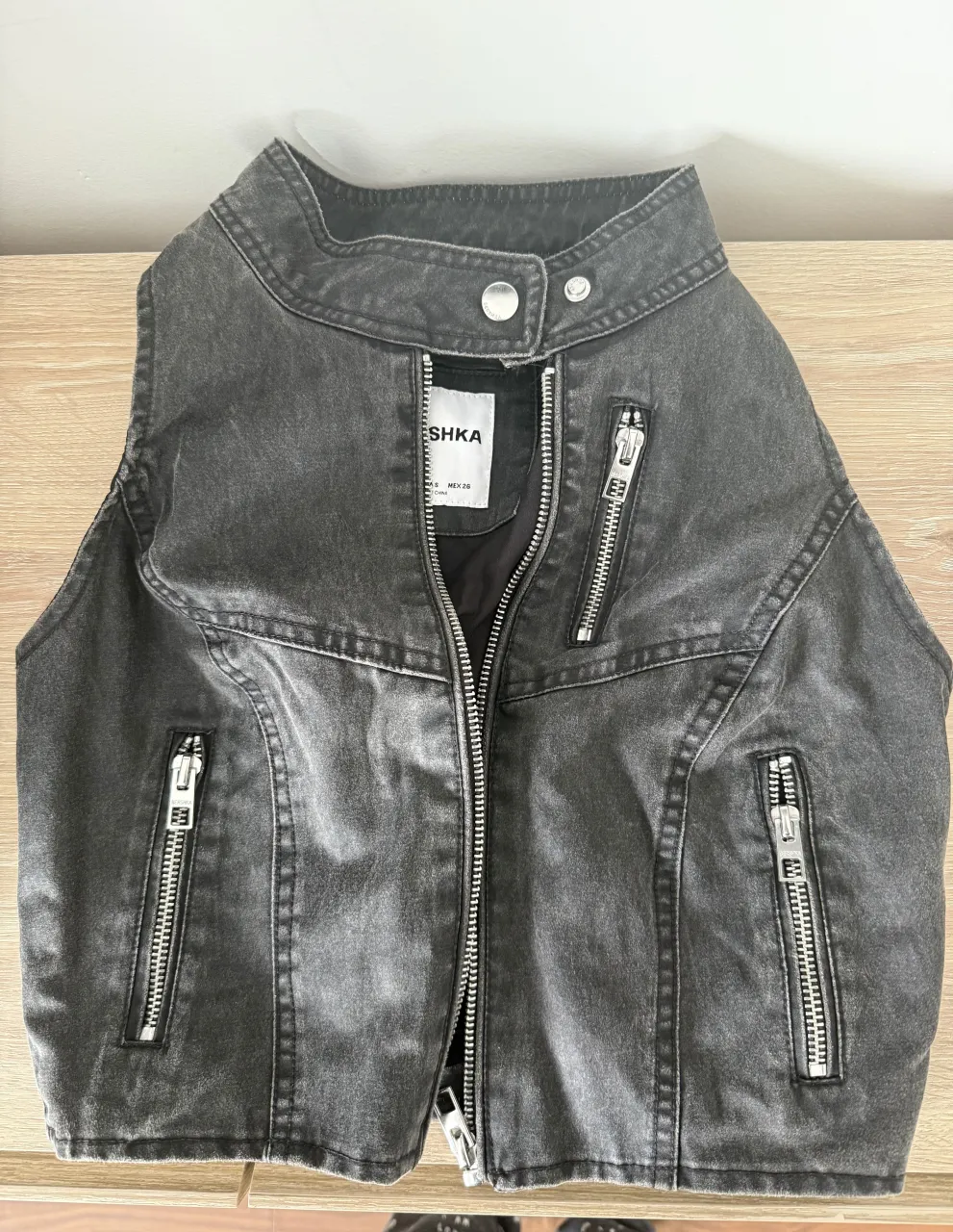 Chaleco/top de cuero sintético color jean gris oscuro con cuello mao y cierre completo. Posee bolsillos con cierre en el frente. Funciona como chaleco y top. Abierta a negociaciones