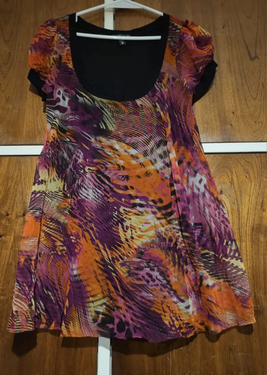 Vestido corto estampado con mangas cortas y escote redondo. Corte amplio, sin cintura marcada. Diseño vibrante y colorido, ideal para un look canchero y moderno.