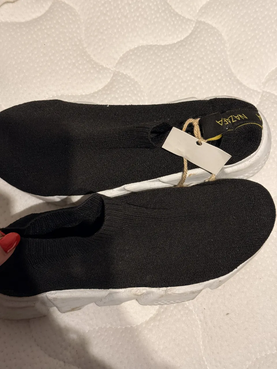 Zapatillas deportivas negras con suela blanca. Poseen una etiqueta con el nombre de la marca.