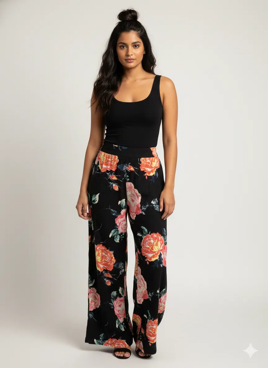 Pantalón palazzo negro con estampado floral de rosas en tonos rojos, rosas y amarillos. Tiro alto y pierna ancha, ideal para un look fresco y femenino.