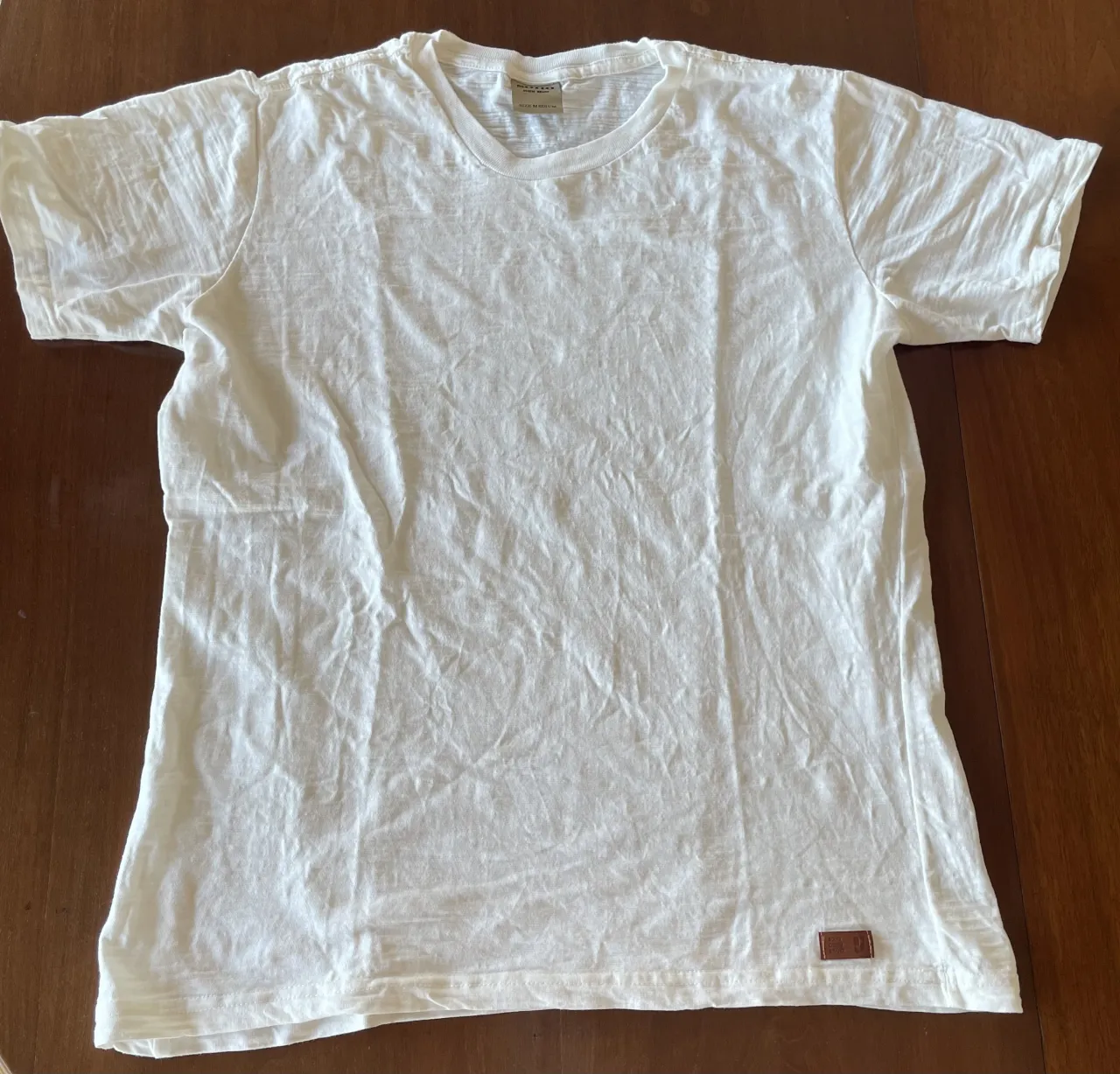 Remera blanca de manga corta con cuello redondo. Posee un pequeño detalle de etiqueta de cuero en la parte inferior derecha.