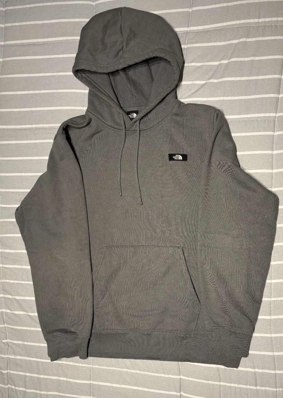 Buzo The North Face gris con capucha, ideal para el día a día. Tiene bolsillo canguro al frente y cordones para ajustar la capucha. Logo pequeño de la marca en el pecho. Talle L Hombros: 51cm Pecho: 62cm Cintura: 60cm Manga: 67cm Largo: 71,5cm