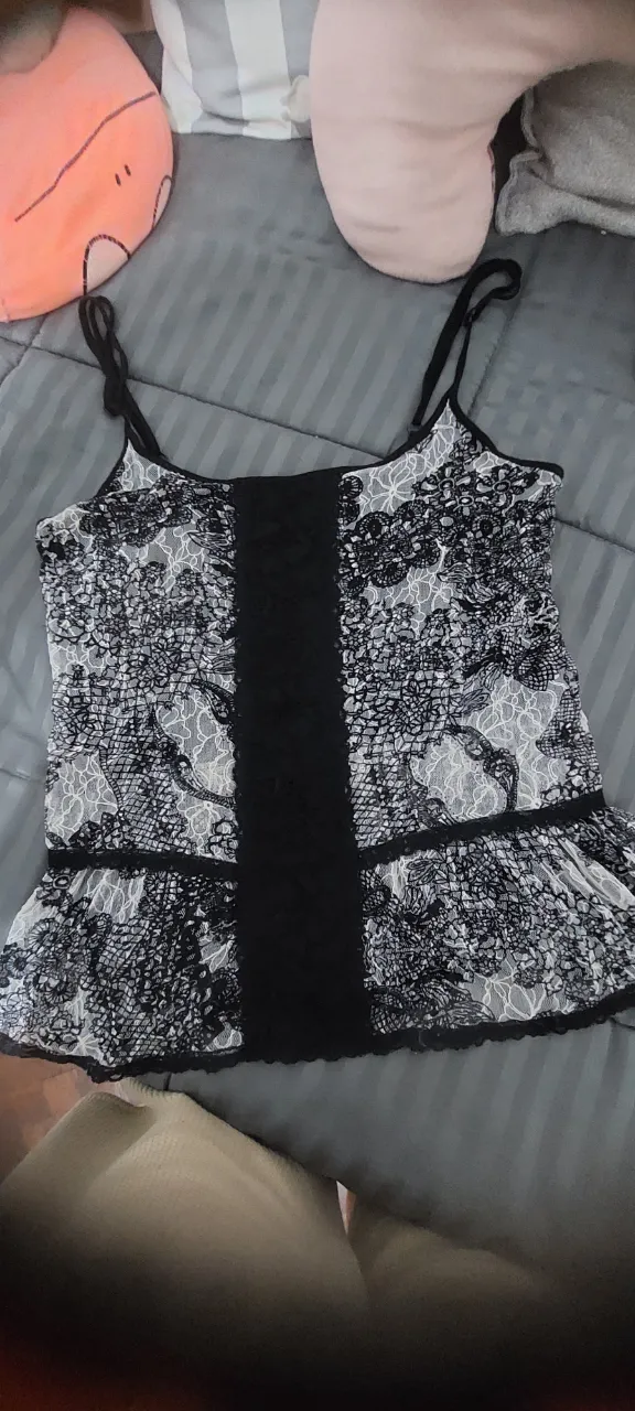 Top de encaje negro y blanco con detalles de tiras y volados. Ideal para un look sensual y atrevido.