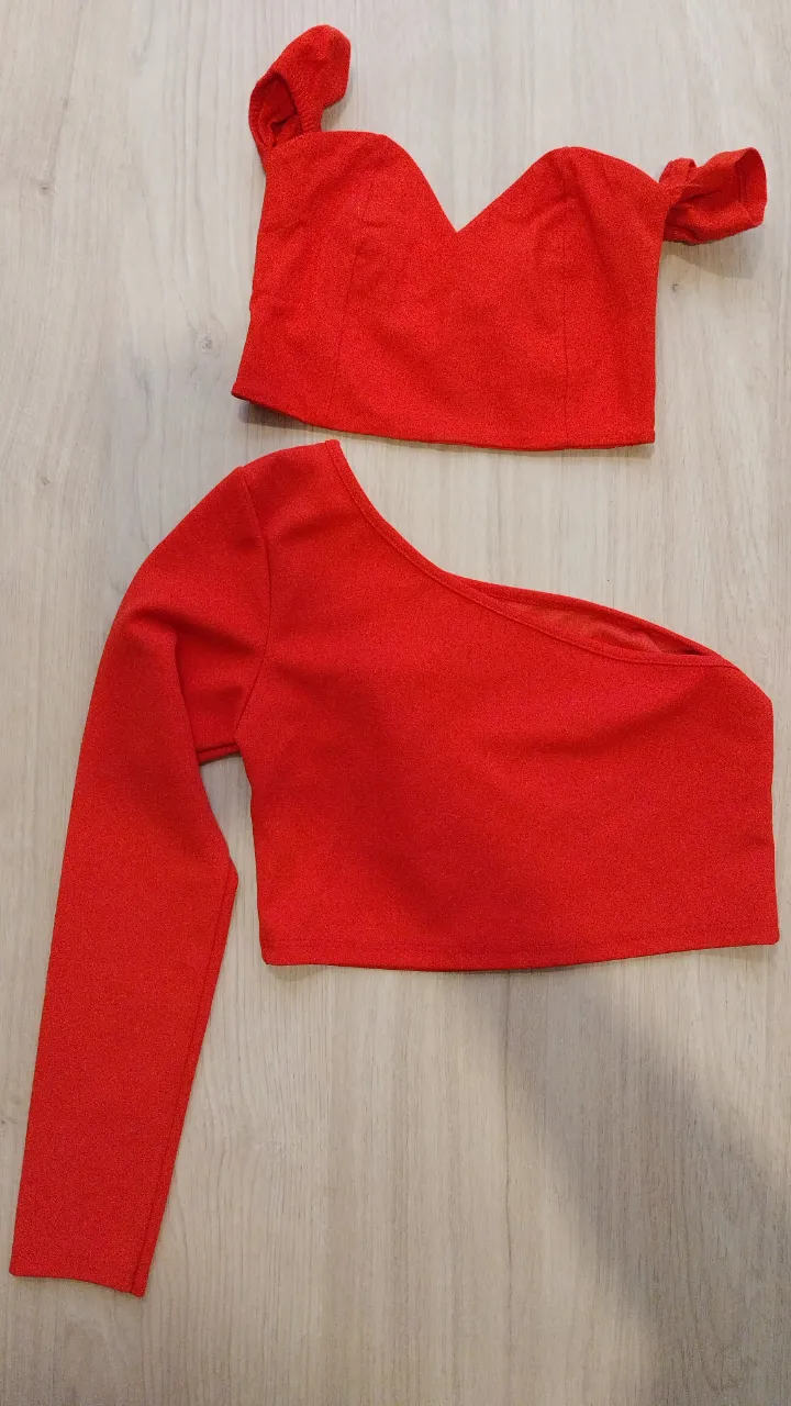Conjunto de dos tops rojos, uno con escote en V y tiras en los hombros, y otro asimétrico de manga larga. Ideales para un look audaz y moderno.