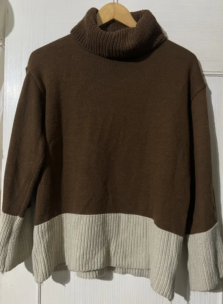 Sweater de cuello alto en color marrón con detalle en color crudo en la parte inferior. Ideal para un look casual y abrigado.