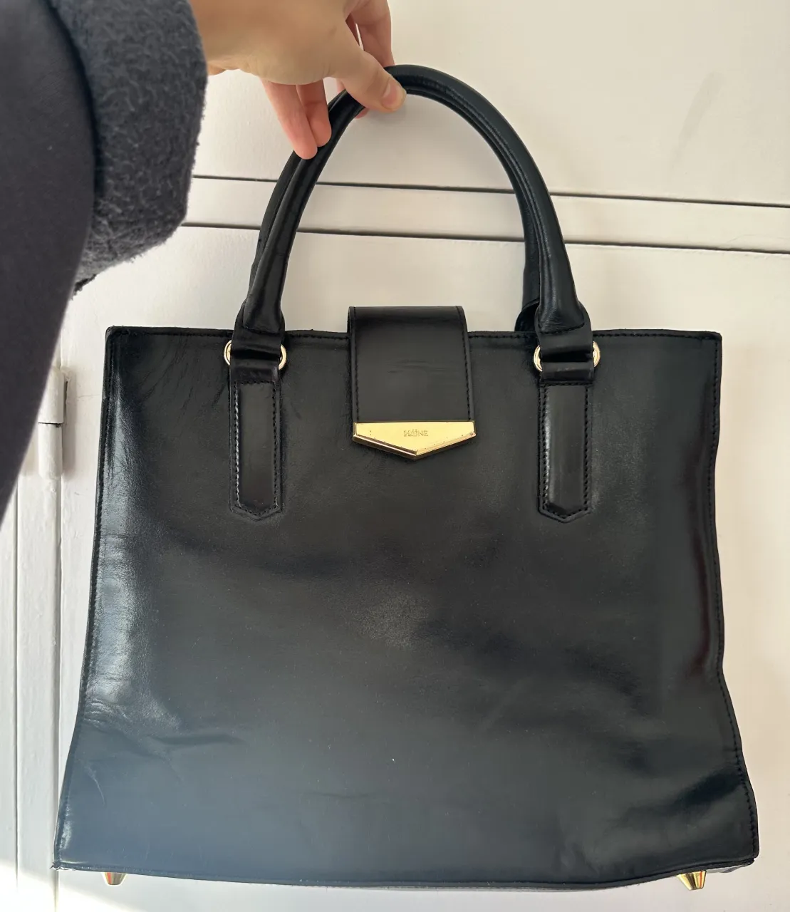 Cartera negra de cuero con manijas cortas y detalle metálico dorado en el frente. El interior está forrado con tela estampada con lunares y el logo de la marca.