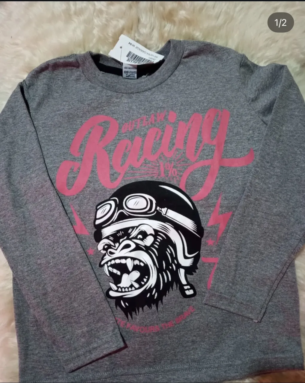 Remera gris de manga larga con estampa de un gorila con casco y anteojos, y la inscripción "Outlaw Racing".