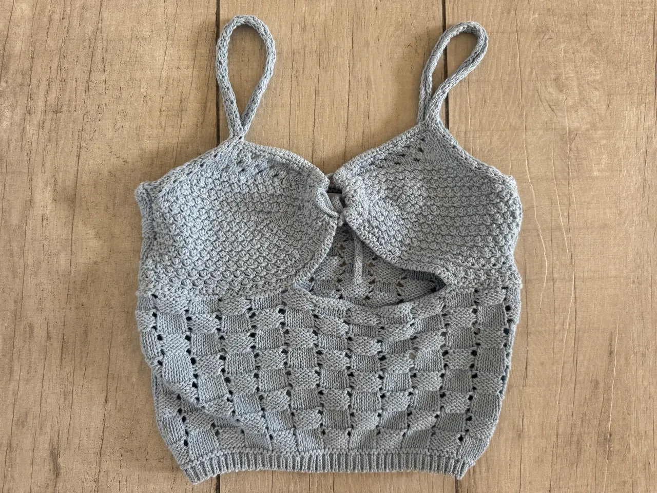 Top tejido de breteles finos y escote anudado al frente. Posee un recorte en la zona del abdomen y tejido a cuadros en la parte inferior.