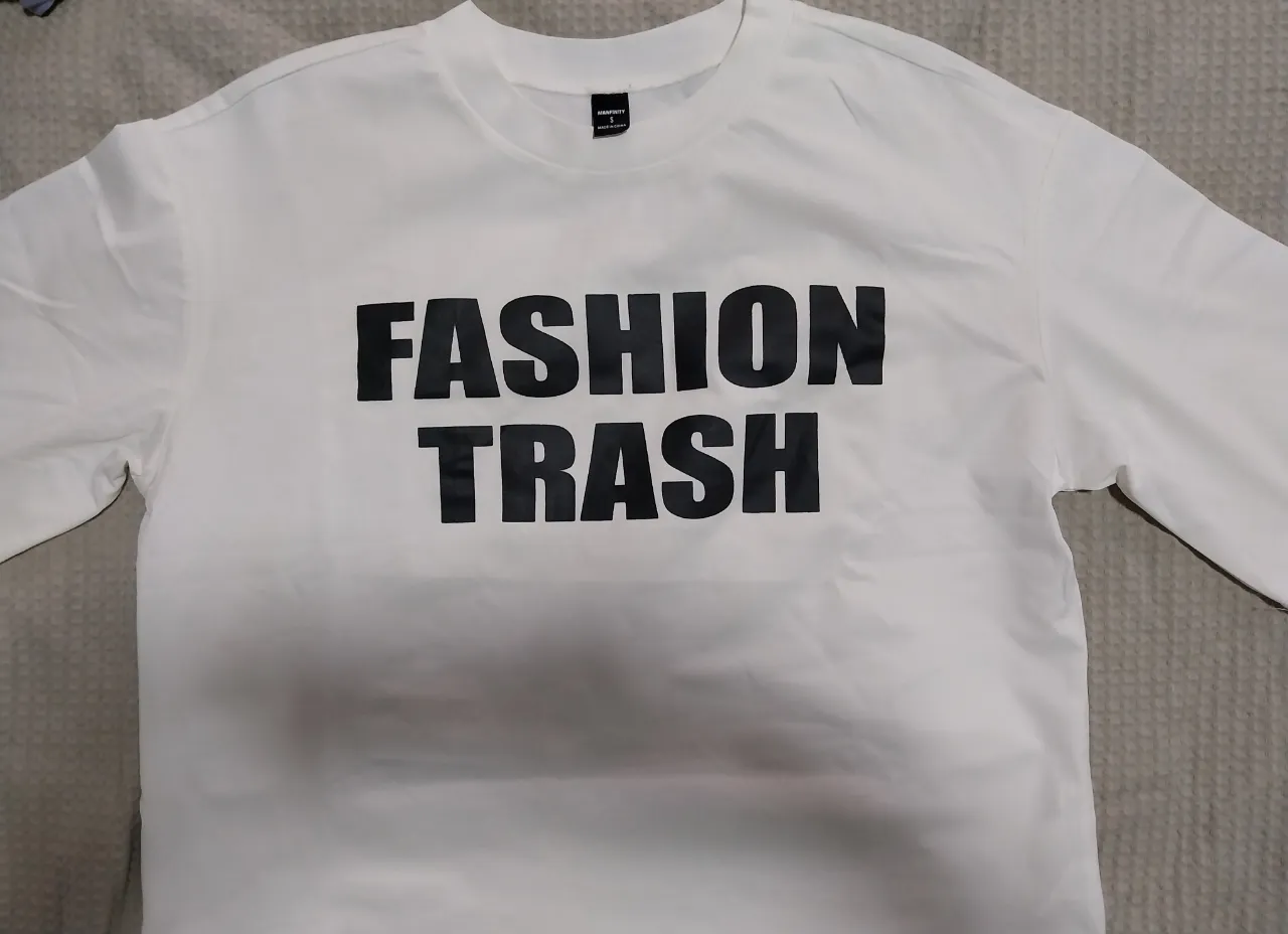 Remera blanca de manga corta con estampa "FASHION TRASH" en negro en el frente. talle s, marca shein. estilo boxy fit