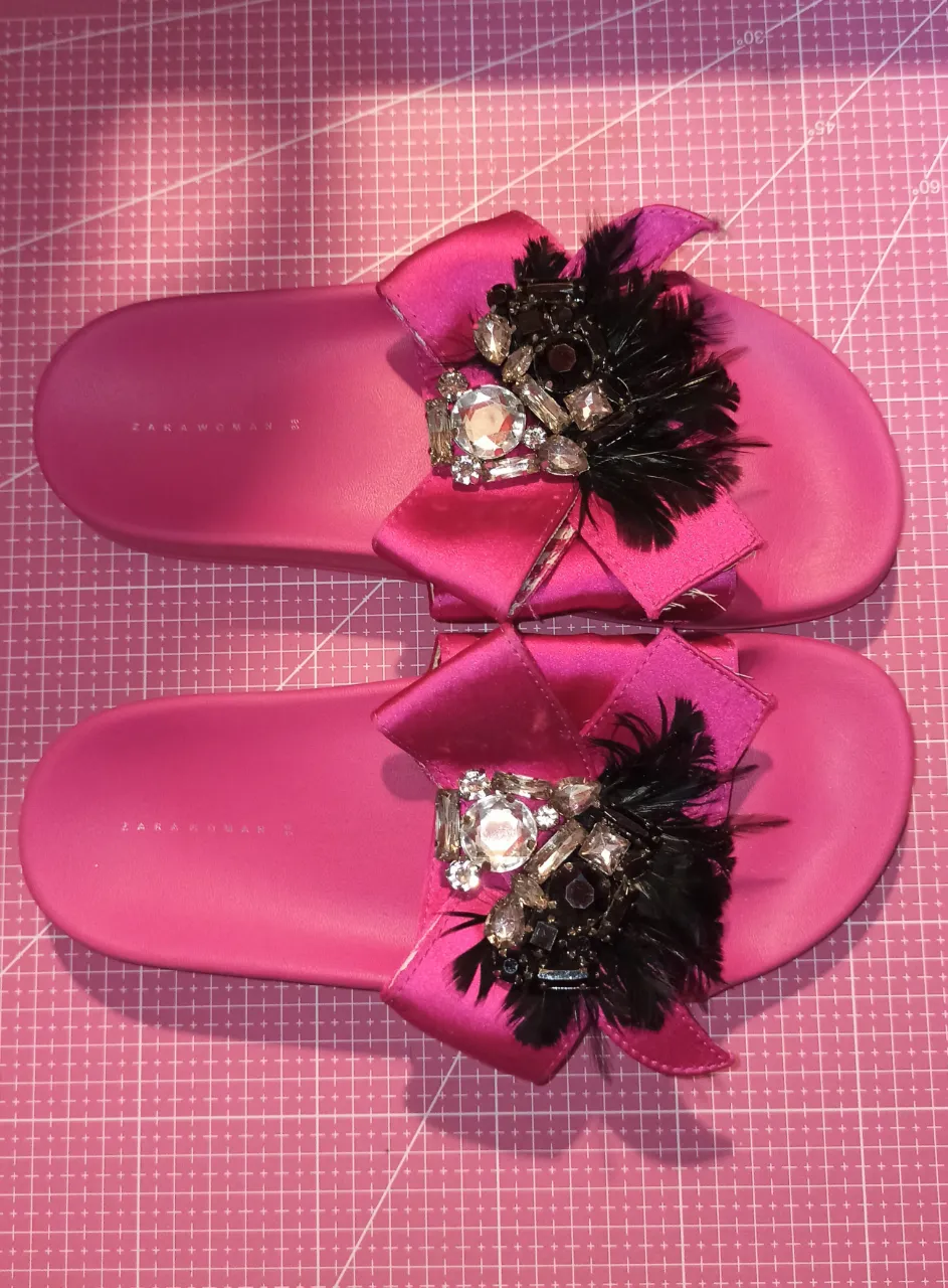 Ojotas de Zara cómodas y cancheras, color fucsia vibrante. Tienen un detalle de lazo de satén con plumas negras y brillos que las hacen únicas. Ideales para darle un toque glam a cualquier look de verano.