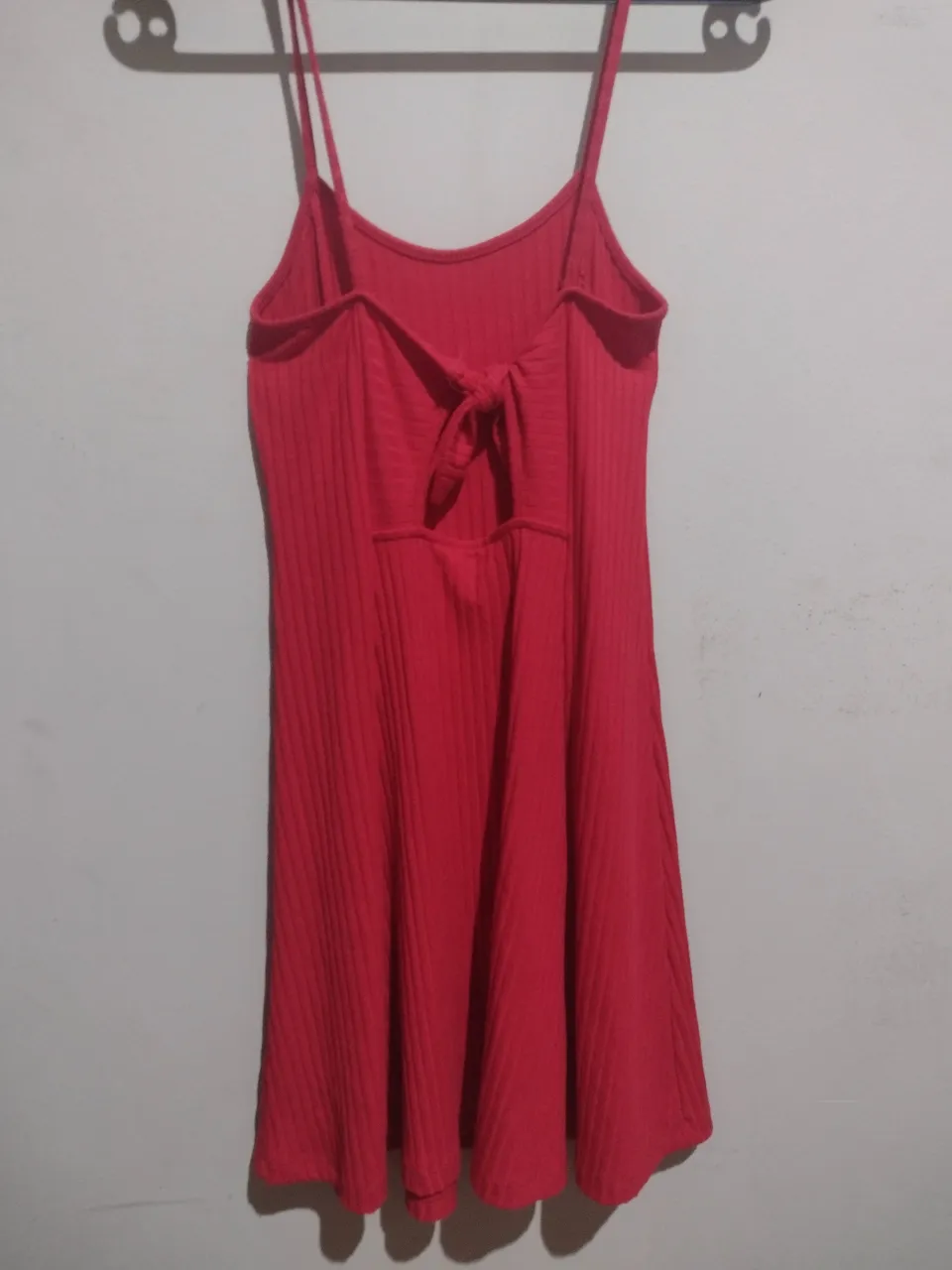Vestido rojo de breteles finos, con escote redondo y detalle de lazo en la espalda. Posee una abertura en la zona de la cintura y falda con caída.