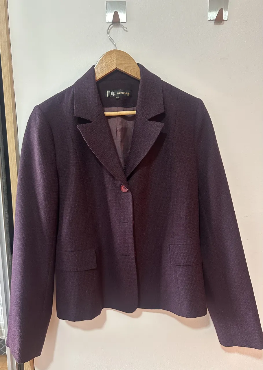 Blazer de vestir color violeta oscuro, con un botón al frente y bolsillos con solapa.