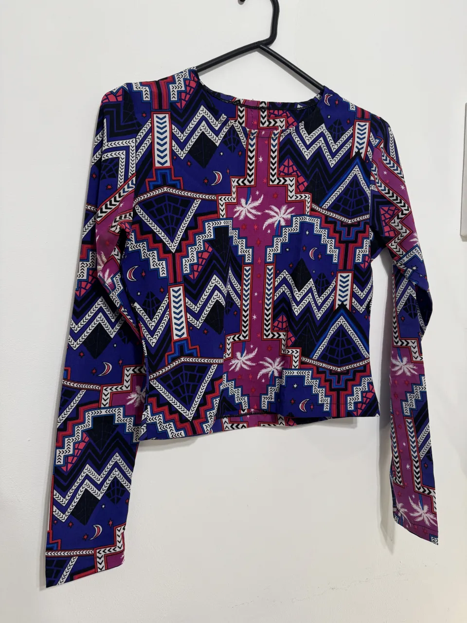 Remera manga larga con estampa geométrica y de palmeras en colores azul, fucsia, negro, blanco y rojo.