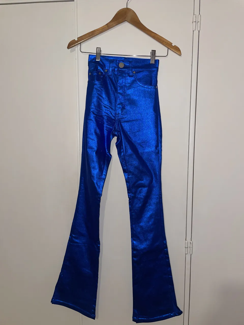 Pantalón azul metálico con efecto brillante. Modelo acampanado.