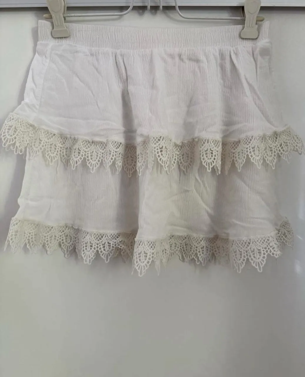 Shorts blancos de tela liviana con volados y detalles de puntilla. Ideales para un look fresco y veraniego.