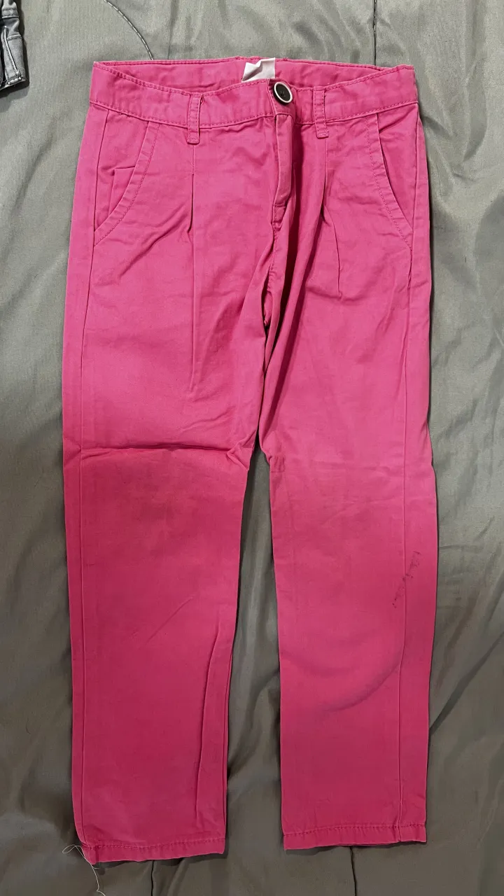 Pantalón rosa con pinzas delanteras y bolsillos laterales. Tiene dos bolsillos traseros con botón.