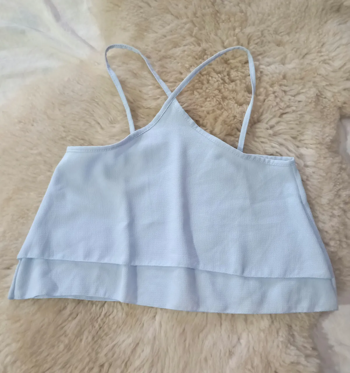 Top celeste con breteles finos cruzados en la espalda. Diseño con dos capas superpuestas en la parte inferior. Ideal para un look fresco y casual.