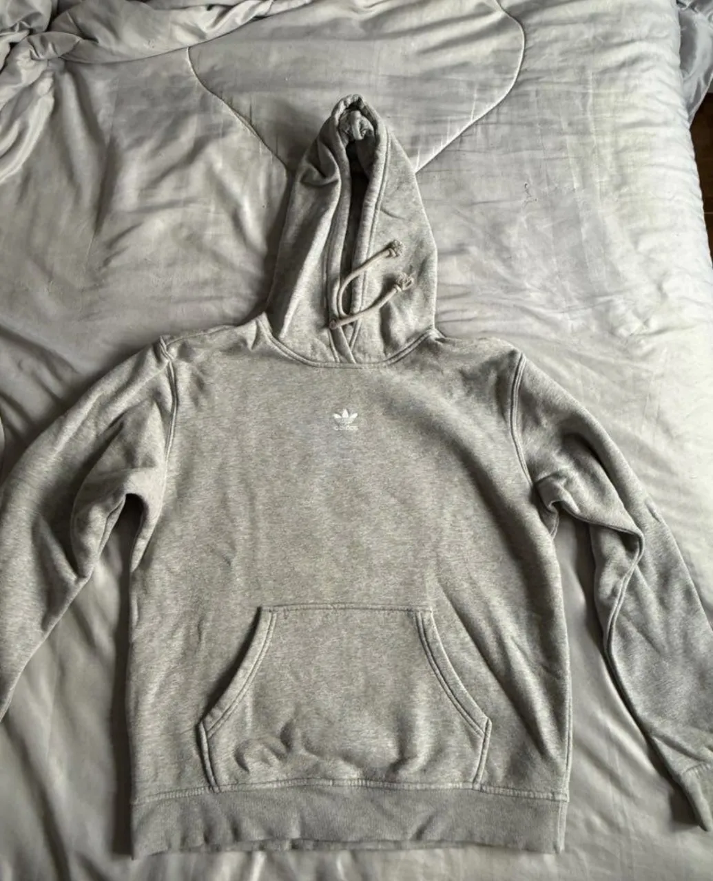 Buzo gris con capucha y cordones. Posee bolsillo canguro al frente y logo de la marca bordado en blanco en el pecho.