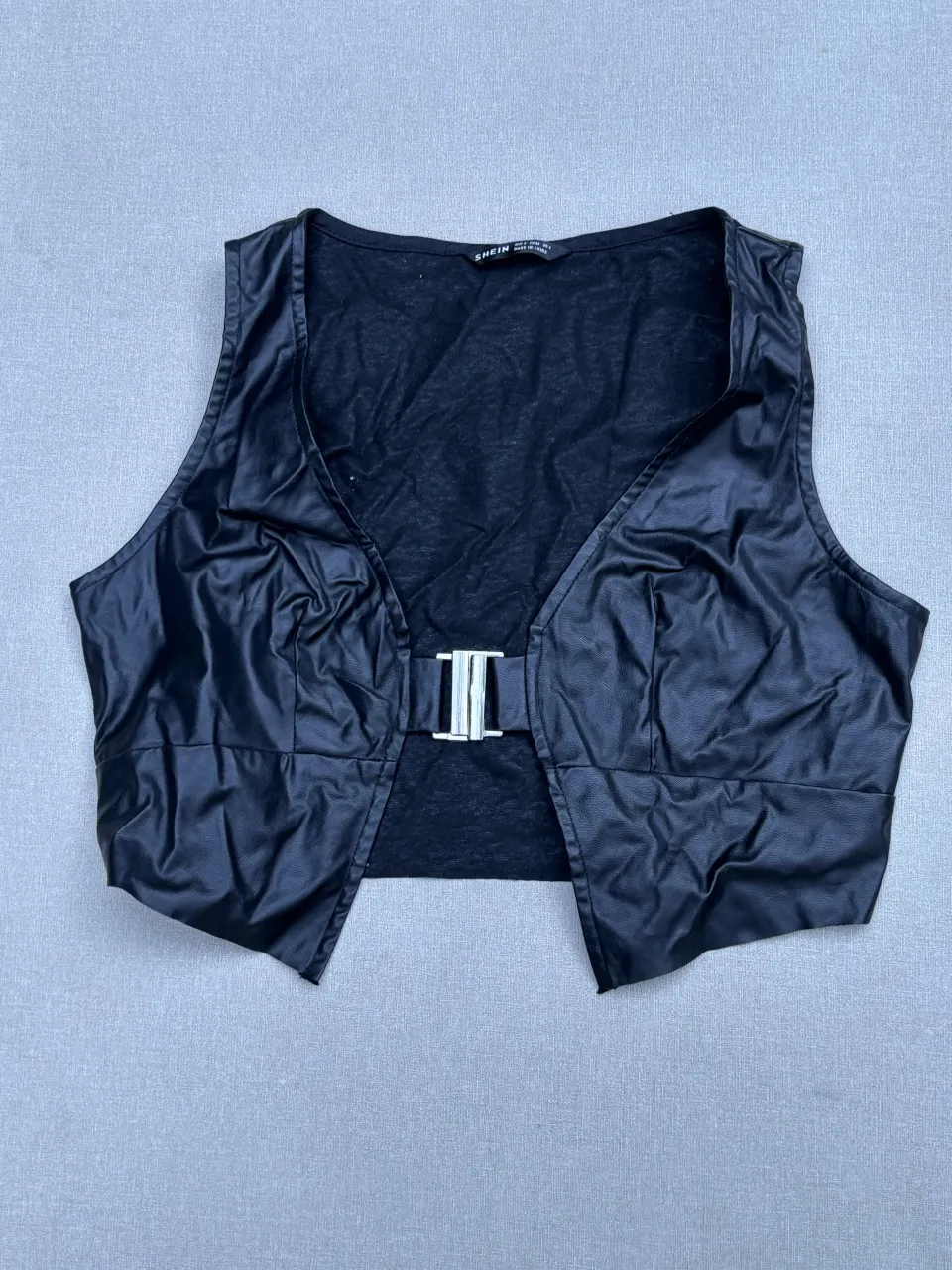 Chaleco negro de cuero sintético con hebilla plateada al frente. Diseño moderno y audaz, ideal para darle un toque canchero a cualquier outfit.