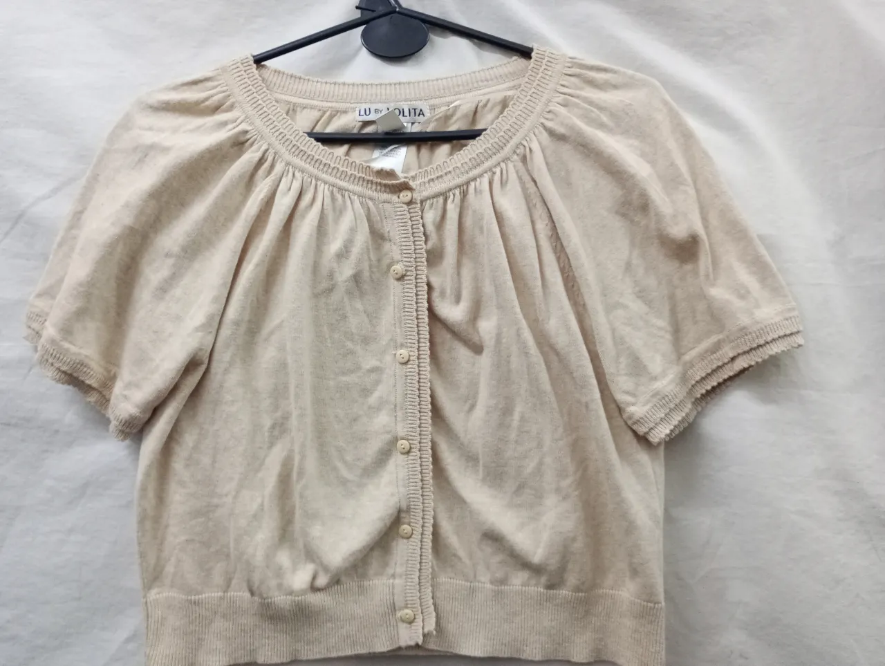 Cardigan tejido color tiza, con mangas cortas y botones al frente. Detalle de puntilla en el cuello y en los puños. Ideal para un look casual y delicado.