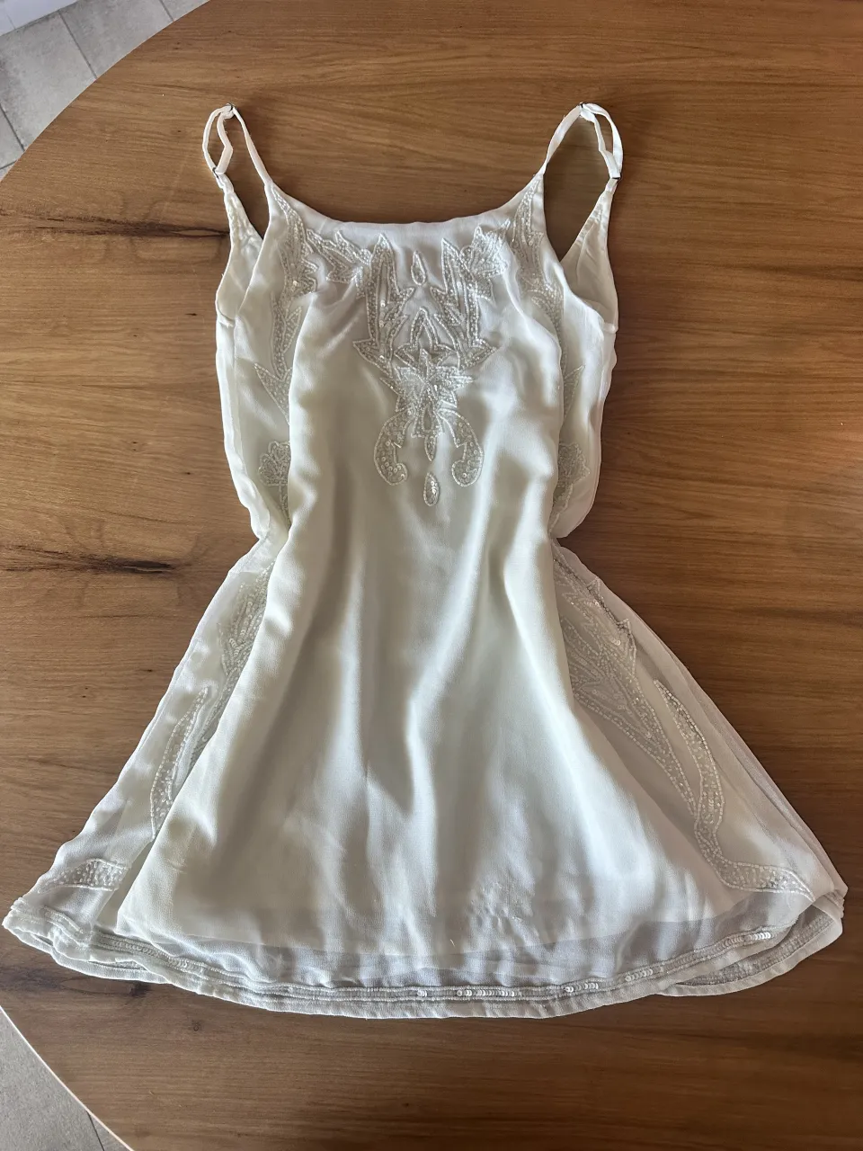Vestido blanco corto con detalles bordados y lentejuelas en el escote y ruedo. Breteles finos regulables. Con forro interno. Se va con bolsa de 47 street verde brillosa.