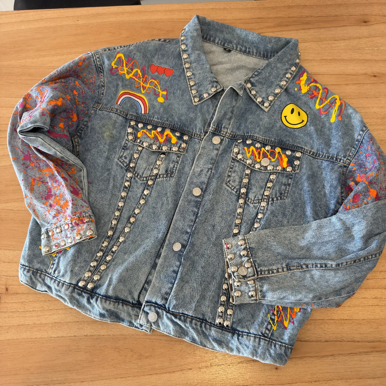 Campera de jean intervenida con tachas plateadas, pintura salpicada en las mangas y parches divertidos como un smiley, un corazón y una flor. Talle 40.